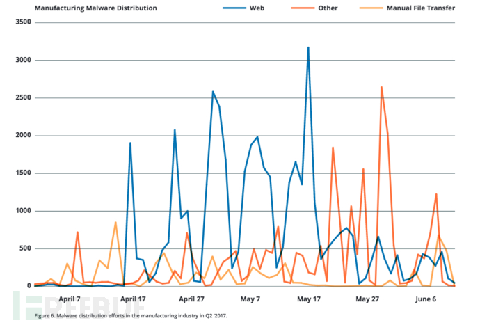 对于制造业来说,今年是难熬的一年,因为33%的侦查攻击都是针对制造业的,预计2017年下半年针对制造业的攻击和恶意软件活动依然会呈上升趋势。